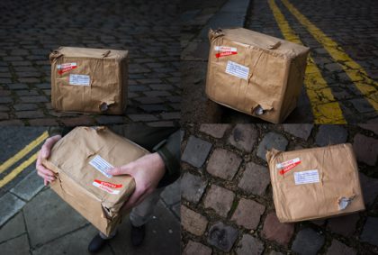 Most of our creativity hinged around battered boxes and a cheeky mock-up of a failed delivery note in a letter box. In that vain I gathered some brown paper and got wrapping. Now, even though I had opportunity to practise over recent festive season, my wrapping skills aren’t amazing, but in this instance “boy wrapping” was exactly what was needed. As any man will admit it’s all very stressful so my next step was to take out those frustrations on the box, to give it a battered look.