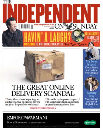 Yesterday, I found myself in The Independent on Sunday newsroom in discussion with The Picture Editor, Art Director and Graphics editor trying to solve a tricky problem. We needed to illustrate a story about the ridiculously poor service offered by parcel courier firms, who managed to loose thousands of deliveries on the run up to Xmas… Not easy, especially as it was needed for the front page.